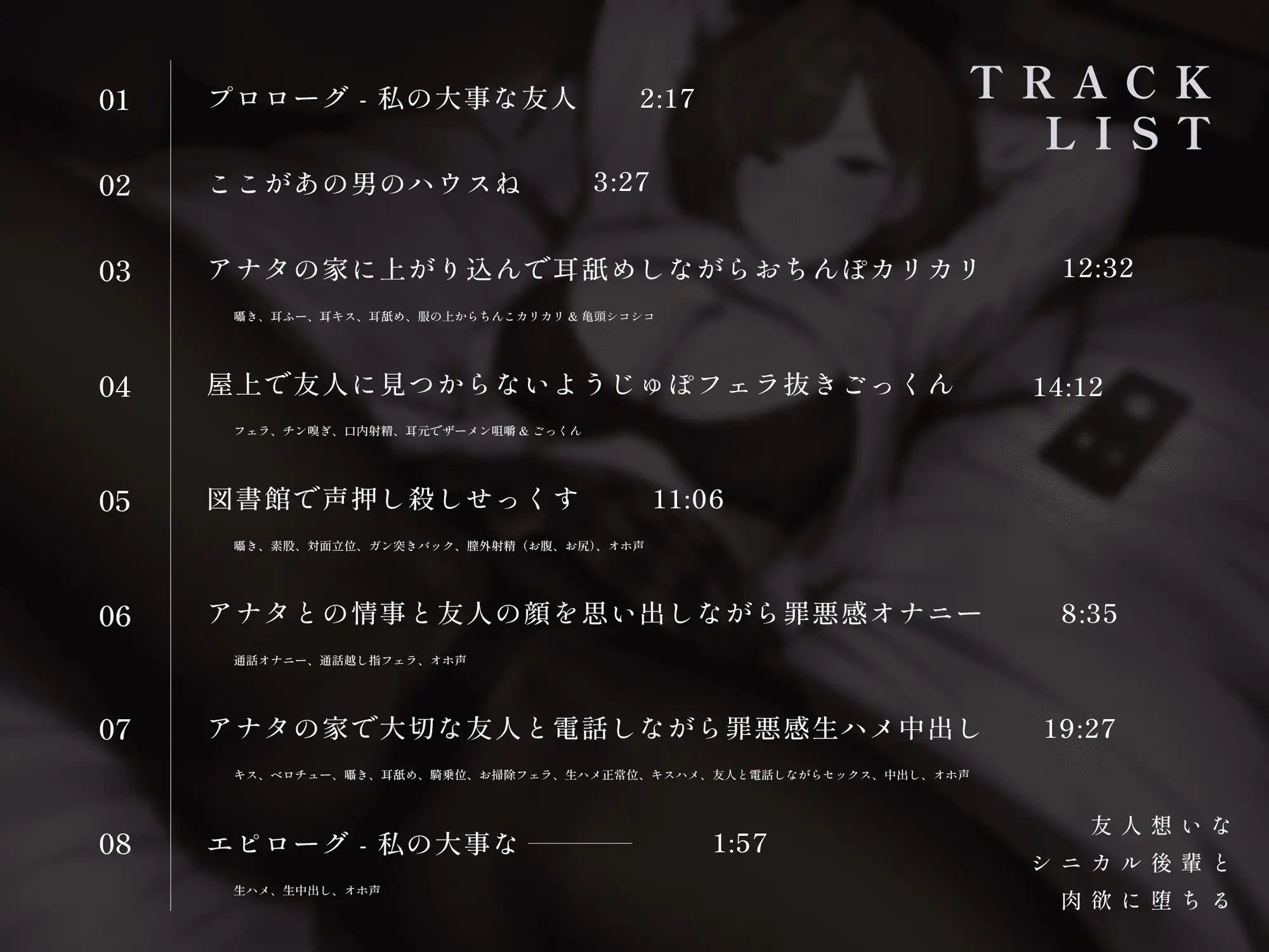 (キス、べろちゅー、囁き、耳舐め、騎乗位、お掃除フェラ、生ハメ正常位、キスハメ、友人と電話しながらセックス、中出し、オホ声)
