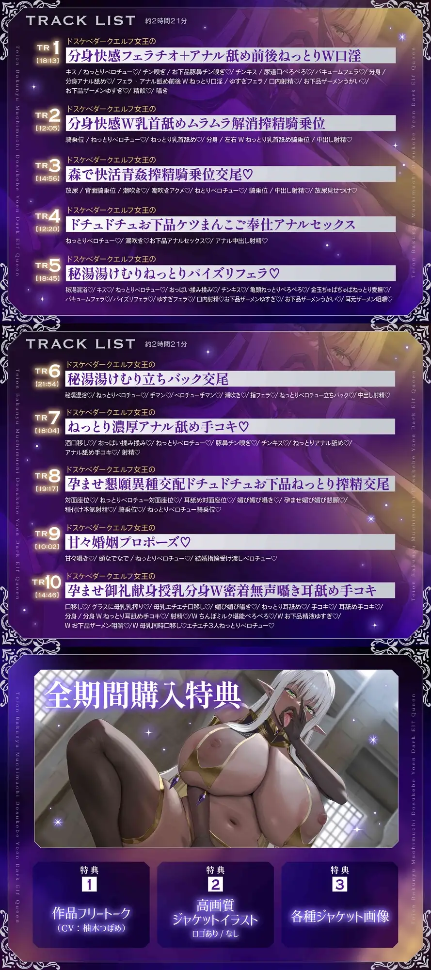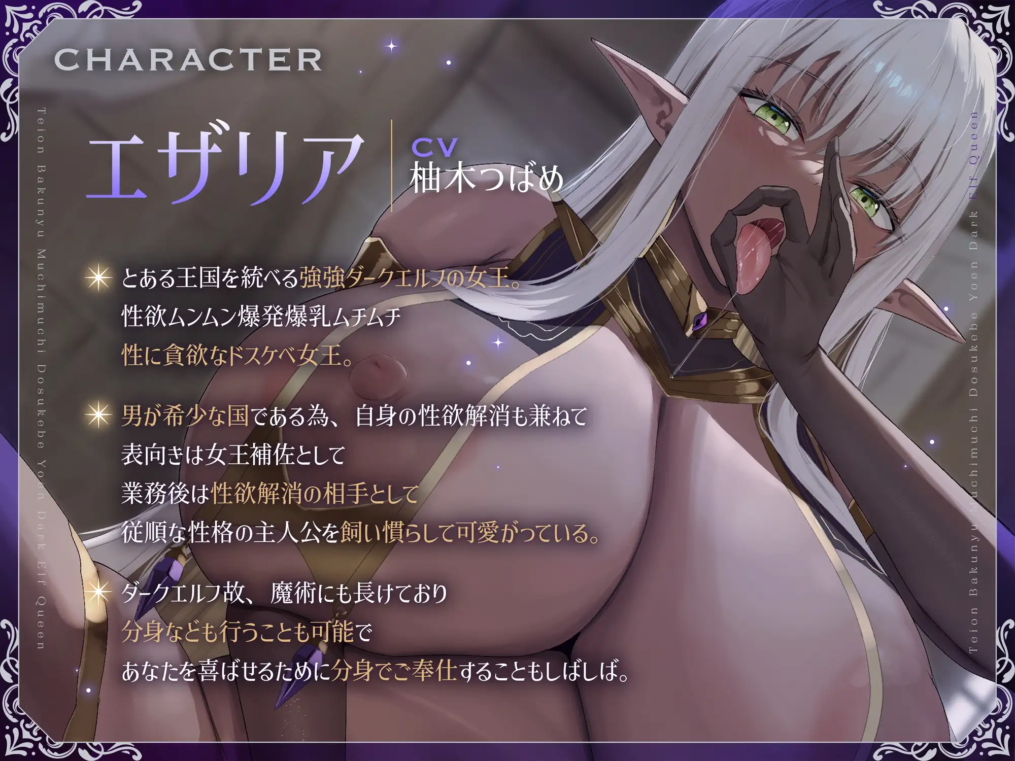 【低音/爆乳/ムチムチ/ドスケベ/妖艶/ダークエルフ/女王/搾精/優越/ご奉仕/魔力/濃厚交尾/フォーリーサウンド/耳舐め/手コキ/フェラチオ/中出し/オホ声/淫語/騎乗位/正常位/対面座位/連続絶頂/失禁/ディープキス/ごっくん】