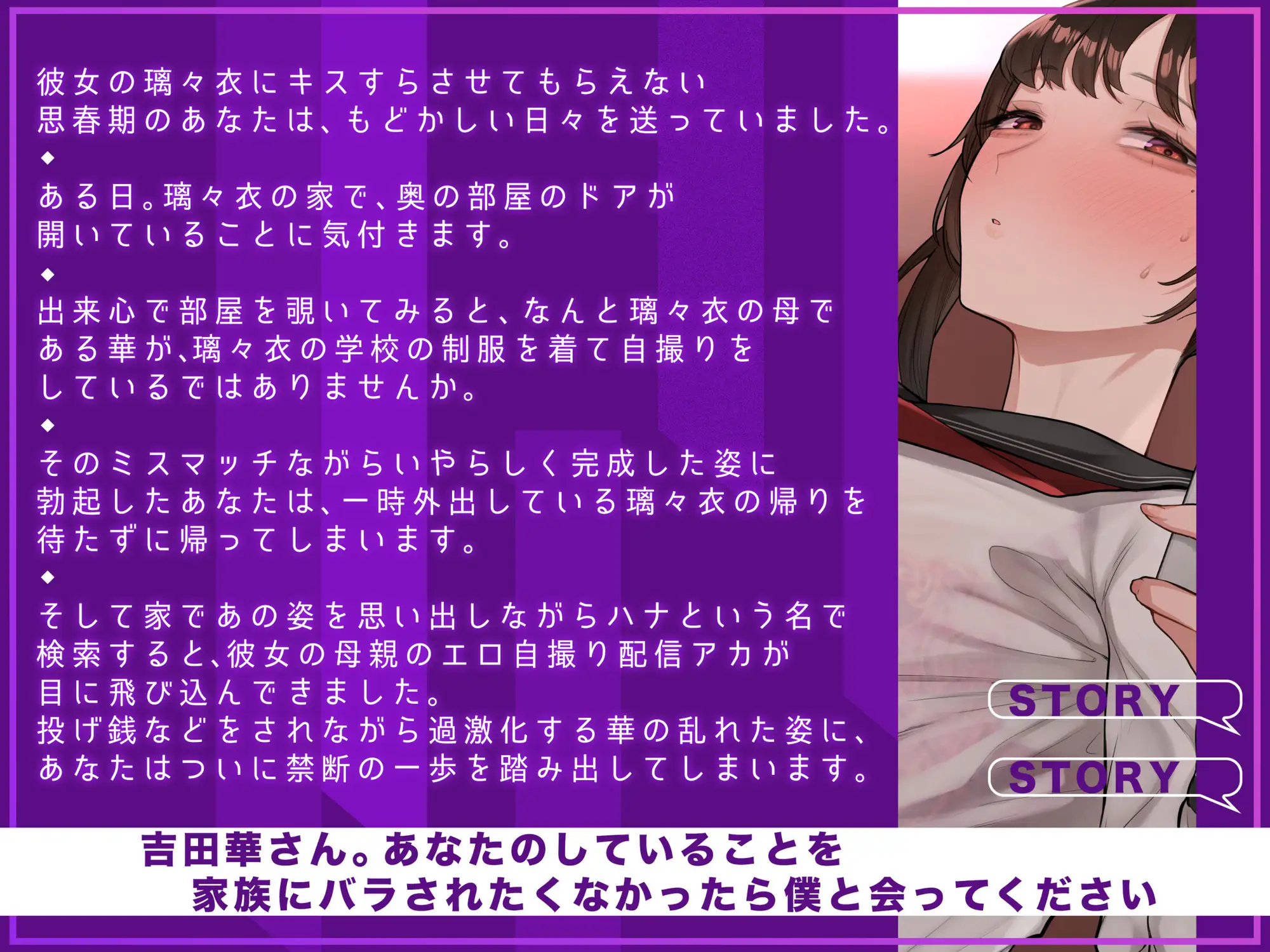 出来心で部屋を覗いてみると、なんと璃々衣の母である華が、璃々衣の学校の制服を着て自撮りをしているではありませんか。